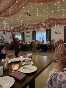 Zoals altijd zitten de bussen vol en komen we aan in een mooi versierde zaal. De 30 jarige jubileumsfeer is verwisseld voor de jaarlijks terugkerende Kerstsfeer… zeer mooi weer. Ook wordt er een mooie Kersttoespraak gehouden in het Nederlands en mogen we genieten van koffie/thee en Duitse Bienenstich, heerlijk. Na de alom bekende modeshow kan er weer naar hartenlust geshopt worden en dat gebeurt dan ook volop.